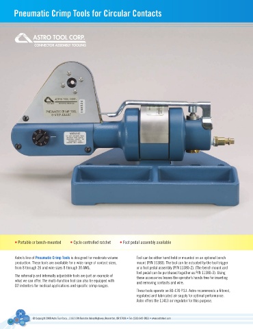 Astro’s line of Pneumatic Crimp tools is designed for moderate volume Tool can be either hand held or mounted on an optional bench