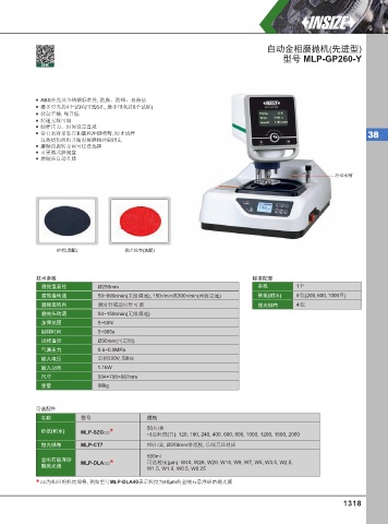 磨抛盘转速 50~999r/min(无级调速), 150r/min或300r/min(两级定速) 砂纸(耐水) 6 张(200, 600, 1000目)
